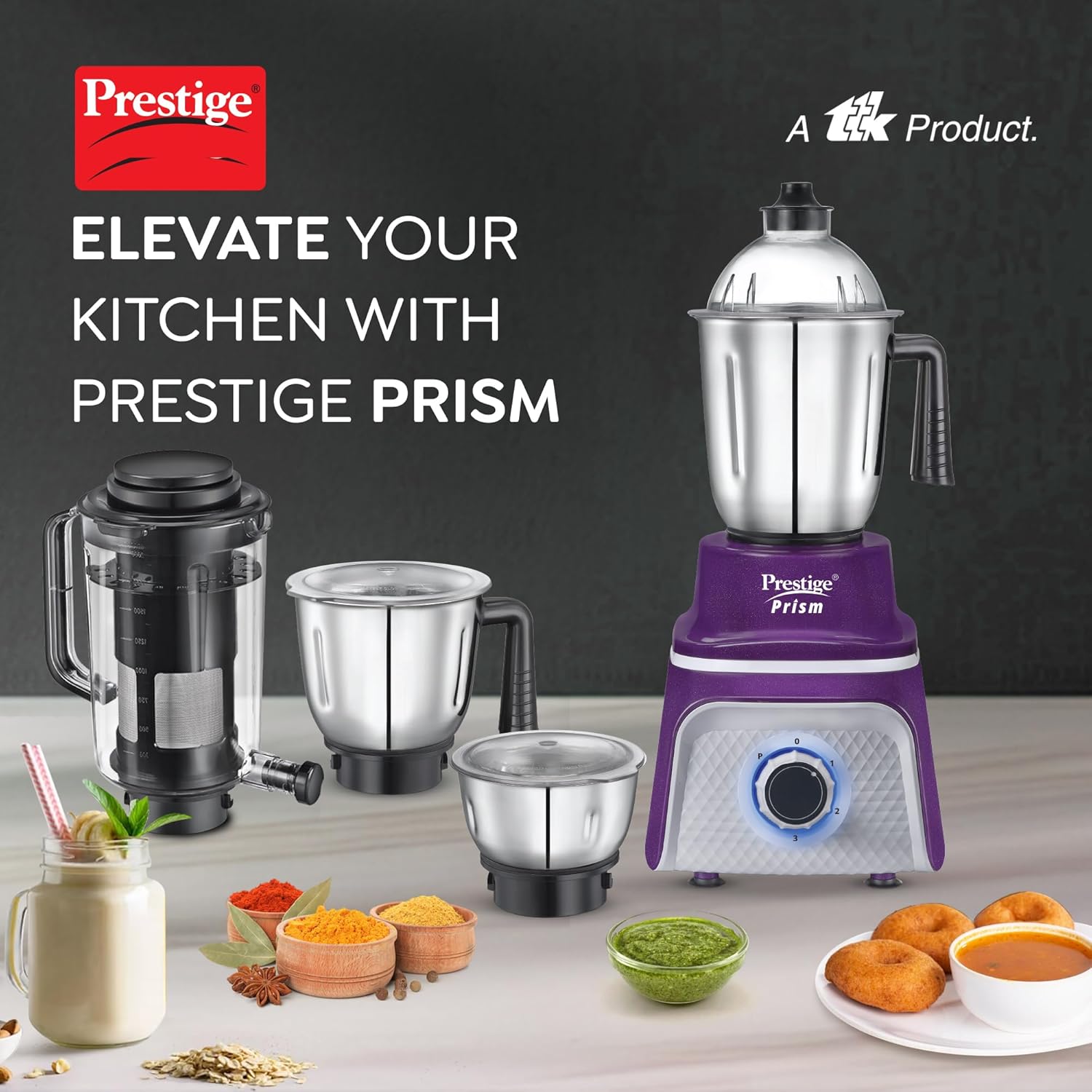 Prestige Prism 750W Mixer Grinder with 3 Stainless Steel Jars & 1 Juice Extracter Jar with pusher & juice outlet|LED Power Indicator|4 super efficient blades|Over load protection|Purple