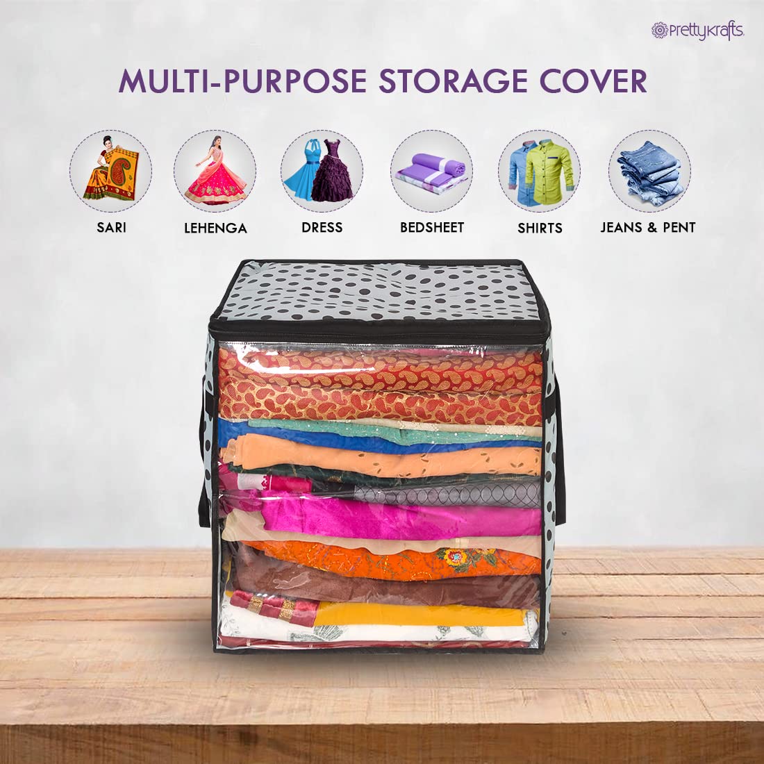 PrettyKrafts XL Saree Cover, Clothes Storage Bag, Storage Organizer Bag, Zip Closure and Transparent Front, Clothes Storage Bag, Wardrobe Organizer, Size (15 X 12 X 15 In), Pack of 1, Dots Grey