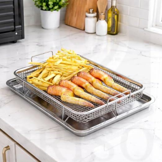 Stainless Steel Air Fryer Basket for Oven Crisper Tray and Basket Oven Air Fry Pan Mesh Basket Set Non-Stick Crisper Oven Tray for Baking and Crispy Chicken French Fries and Onion Rings.