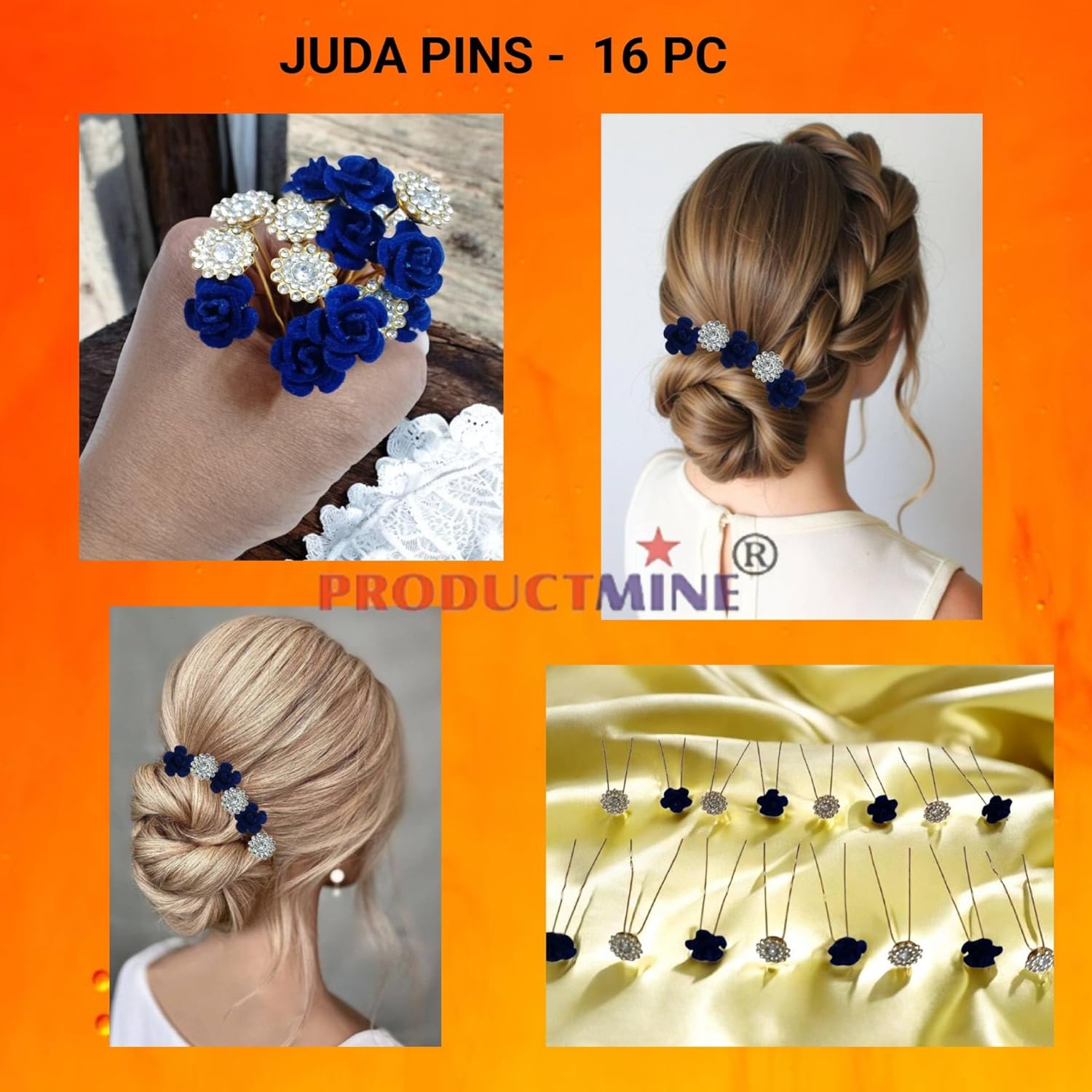 PRODUCTMINE® Bridal Hair Bun Pin Accessories/Fancy Golden Juda Pins with Artificial BLUE Rose and Clear Rhinestone for Women and Girls – Set of 16 PCs