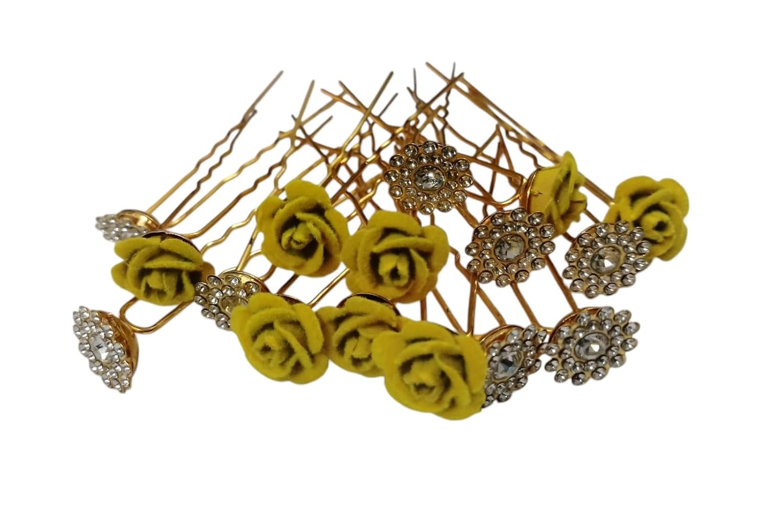 PRODUCTMINE® Bridal Hair Bun Pin Accessories/Fancy Golden Juda Pins with Artificial Yellow Rose and Clear Rhinestone for Women and Girls – Set of 16 PCs