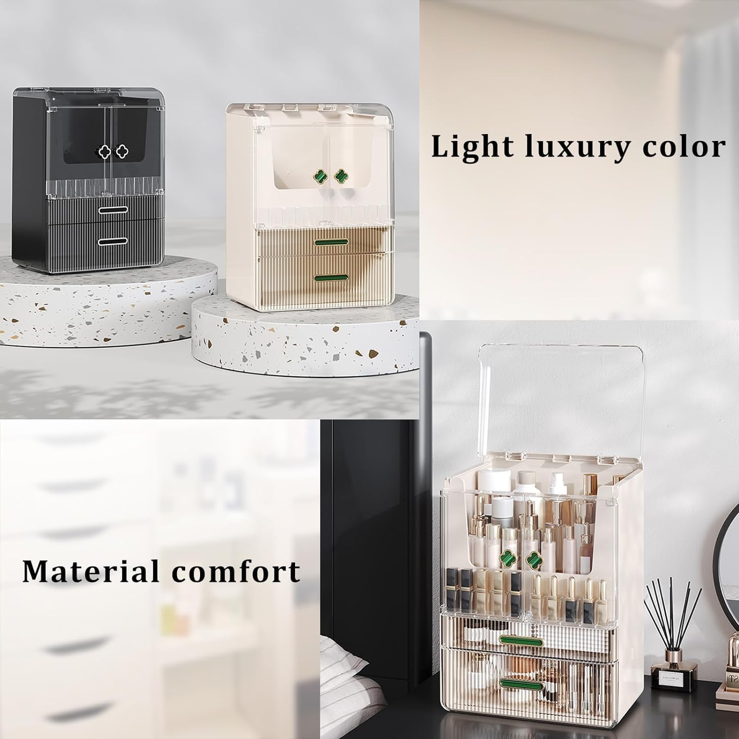 【High-Quality Materials】This dustproof makeup storage organizer is made of high-grade PET+ABS material, which is safe and non-toxic, with high quality guaranteed. If there are any problems with the product during use and transportation, you can contact us. We will help you solve the problem immediately.