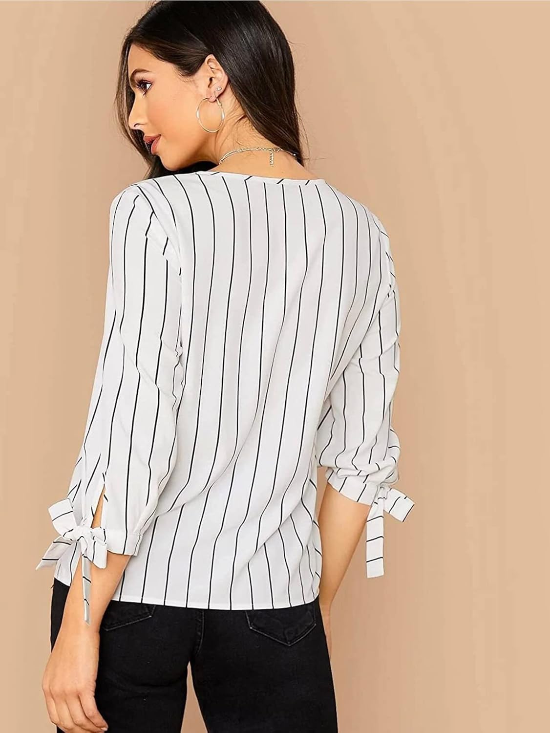 Pujia Mills Women’s Turtleneck Striped 3/4 Sleeve Bow Tie White Top