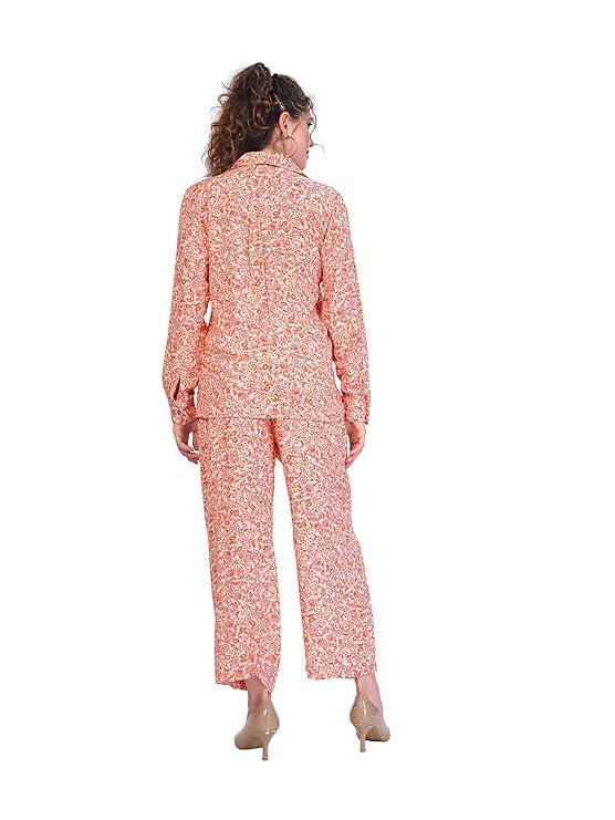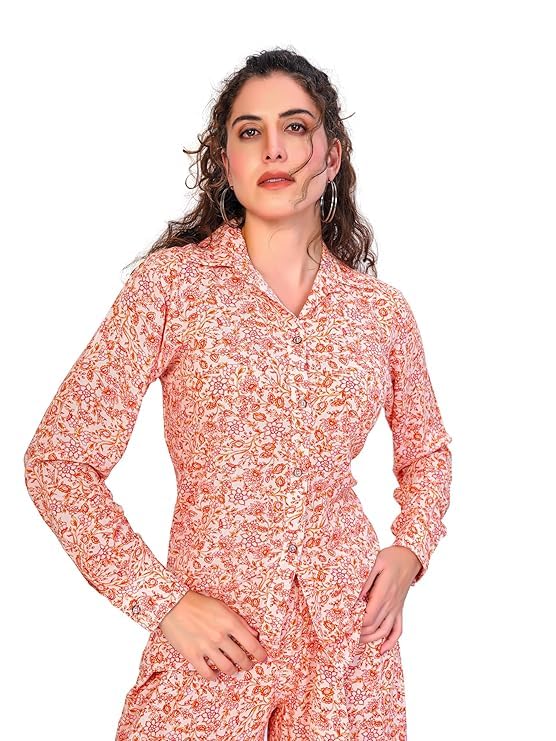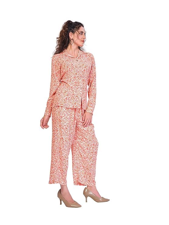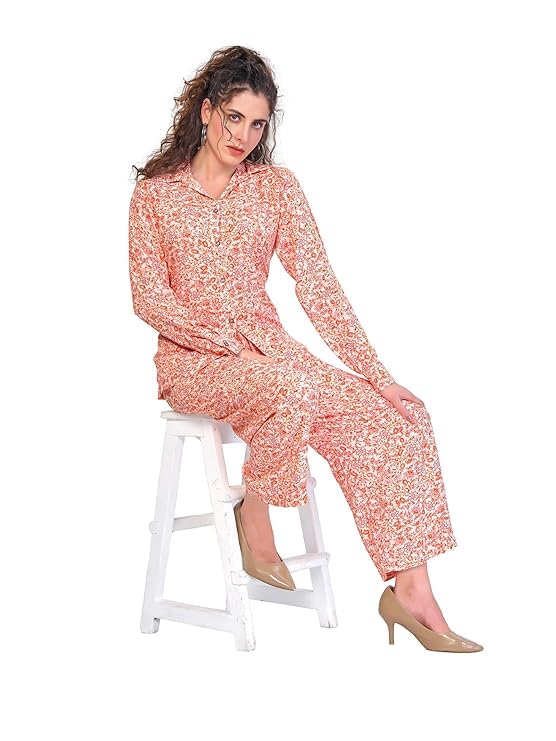 • Purple & Pink Printed Shirt and Pajama Cord Set for Women – Orange | Top and Bottom Matching Co-ords Set | Casual Wear, Night Wear and Sleepwear