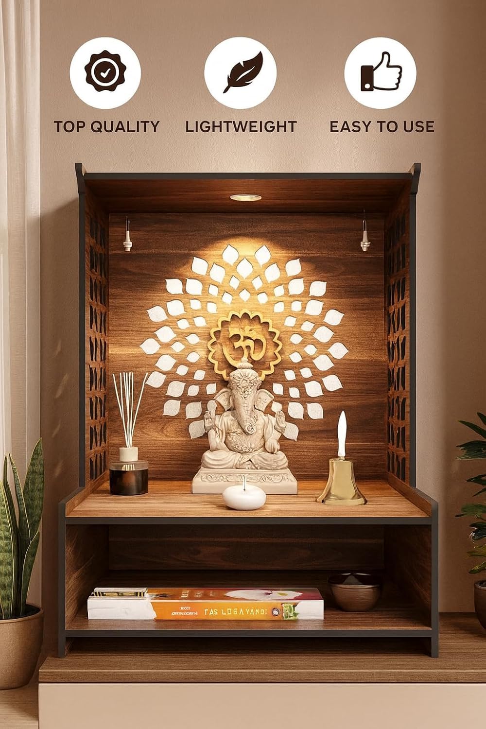Premium Quality Engineered Wood: Built to last with superior craftsmanship.Wall-Mounted Design: Saves space while keeping your prayer area organized and clutter-free.Storage Cabinet: Includes convenient storage for pooja utensils for home mandir, pooja clothes for home mandir, and other accessories.Glass Door Option: Choose a pooja mandir with glass door for a sophisticated, protective feature.Versatile Size Options: Available in both small and big sizes, making it perfect for any home, from cozy apartments to large homes.Perfect for Office or Home: A harmonious blend of functionality and traditional aesthetics.Easy Installation: Designed for easy wall-mounting, making it a convenient addition to your living room, office, or prayer room.Ideal for Pooja Essentials: Perfect for displaying idols, lighting candles, and holding pooja accessories for home mandir.Beautiful Design: Features intricate woodwork that adds a divine and peaceful ambiance to your space.