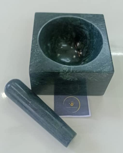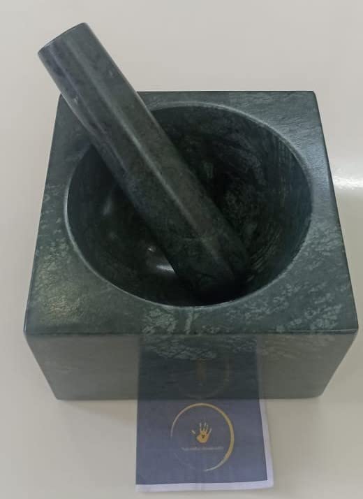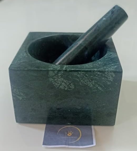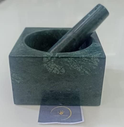 Dimensions: Mortar – 5x5x4 big size, Green Marble Granite Masher, Good for grinding spices and prepare ingredients or substances by crushing and grinding them into a fine paste or powder in the kitchen, laboratory, and pharmacy.