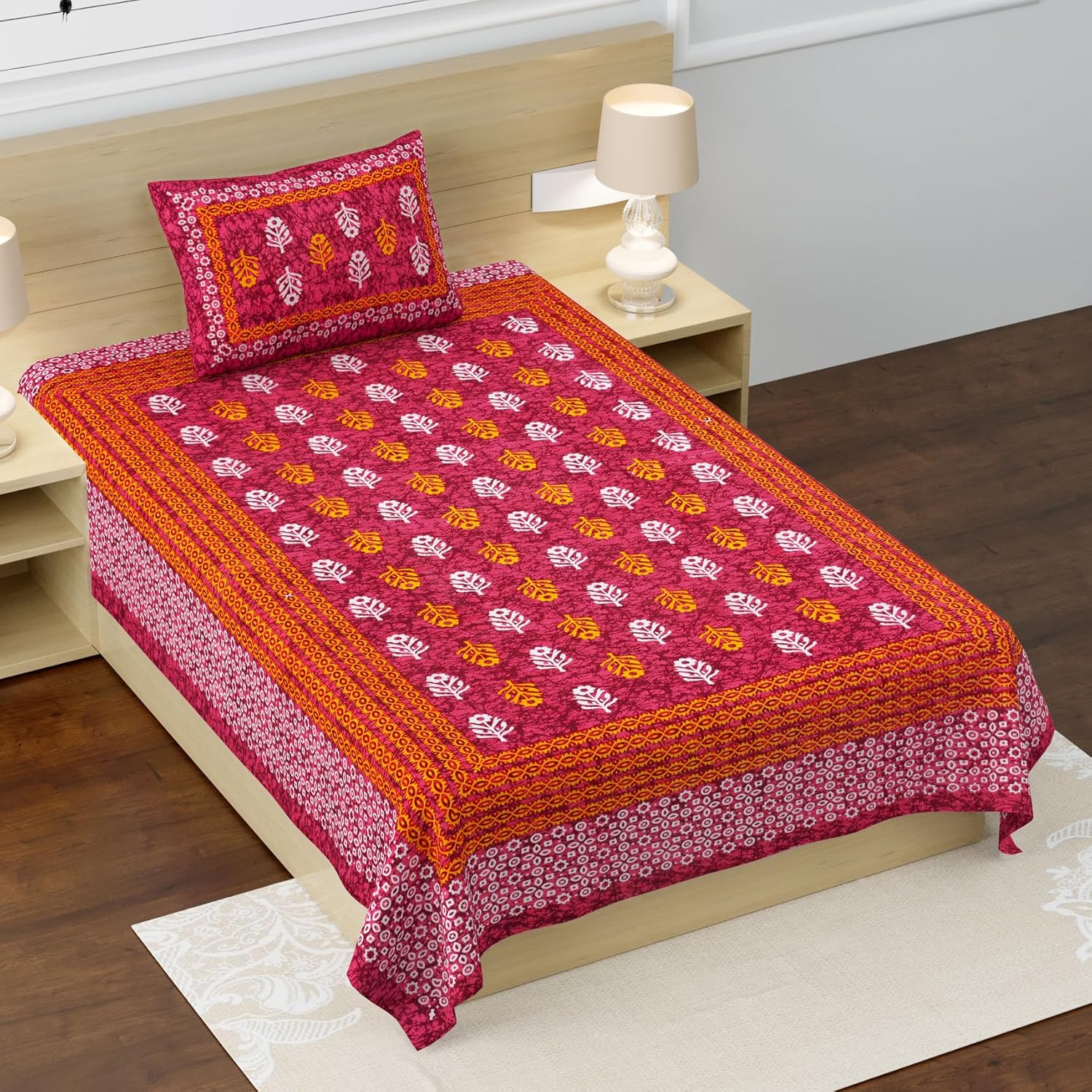Dress your bed in style with the versatile and attractive range of single bedsheets from rajasthanikart. The Jaipur-printed bed sheets feature traditional-themed floral patterns in lively hues. Also, the 100 percent cotton fabric ensures skin-friendliness, easy wash ability and color-fastness. The world has known fewer other pleasures to match the pampering comfort of a welcoming bed at home. A fine fusion of both comfort and design- this vibrant and ethnic range of bed sheets is all you need for a restful sleep this summer. Buy them at lowest prices online. Wash care machine/hand wash with mild detergents. Do not bleach and wash separately for the first time.
