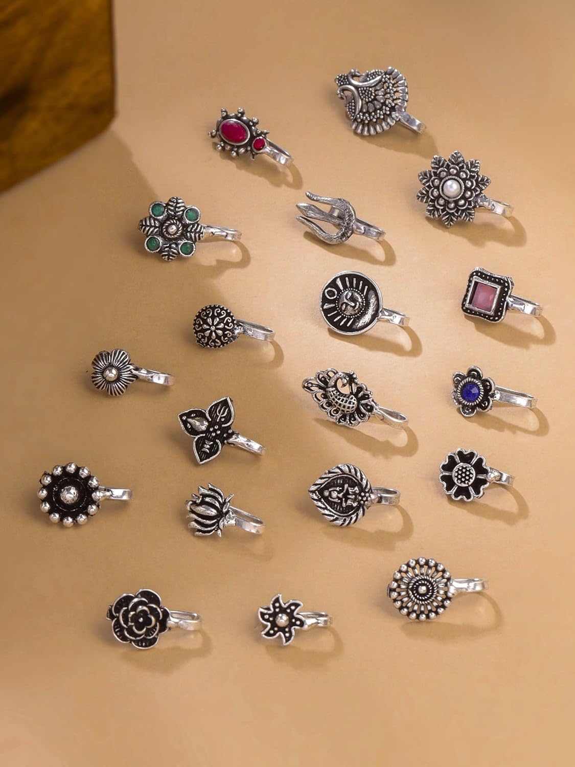 Rangriti Collection Oxidised Non Piercing Nose Pin Nose Rings Combo Of 19 For Women | Silver Colour | Anniversary Birthday Gift