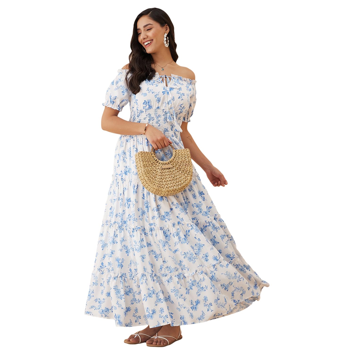 black floral maxi fit and flare dress, has a off-shoulder, short sleeves, puff sleeves, flared hem