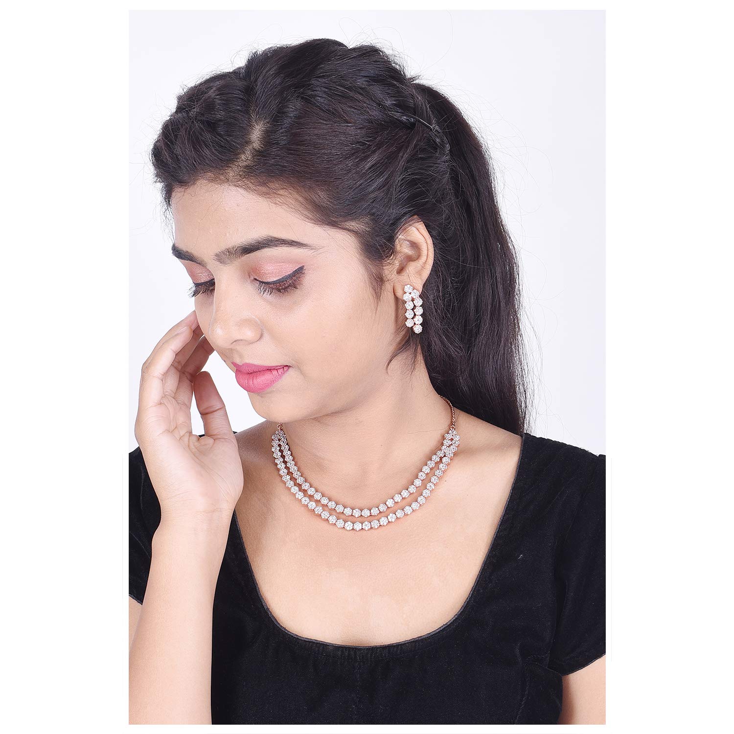 Women love wearing jewellery before they step out in public as it allows them to look their absolute best and flaunt their true beauty. With the ever-changing trends in fashion, it is sometimes difficult for the modern woman to decide on the type of jewellery that would go with their outfit. Ratnavali Jewels brings to you American Diamond CZ Rose Gold Plated Necklace Set that is a perfect addition to your wardrobe because of its beautiful design and versatility. This necklace set consists of a chain and a pair of earrings that are a good choice for young girls as well as adult women as it makes them look gorgeous every time they put on this necklace.