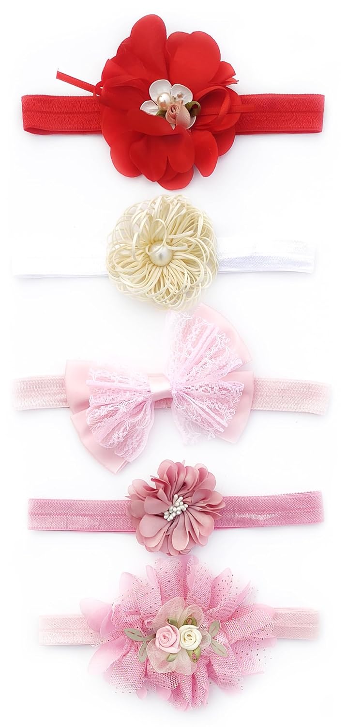 RedChimes Premium Flower Soft Bow Headband Super Elastic Band Hair Accessory For Baby Girls & Baby Boys (Pack of 5 Pcs)