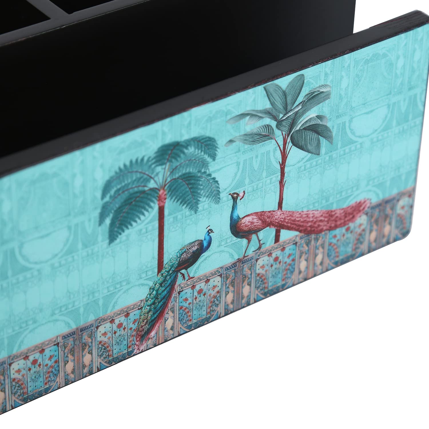 This wooden holder provides four separate sections to neatly store tissues in one area and cutlery, utensils or other small items in the remaining three sections.