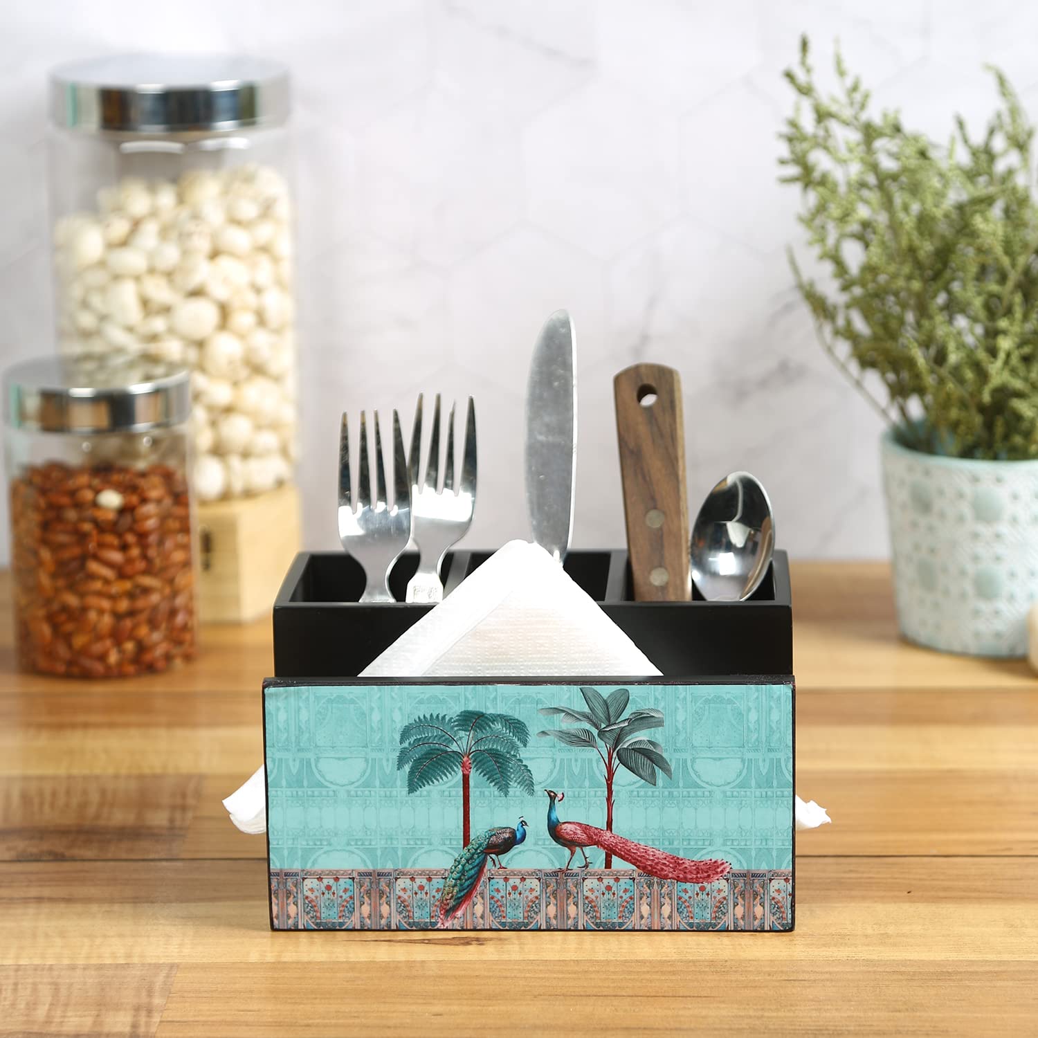 Tired of cluttered countertops and searching for cutlery? The Reinvention Factory Wooden Cutlery Holder is the perfect solution to bring order and elegance to your dining space. Crafted with care and designed for functionality, this countertop organizer keeps your spoons, forks, knives, and napkins neatly arranged and easily accessible.