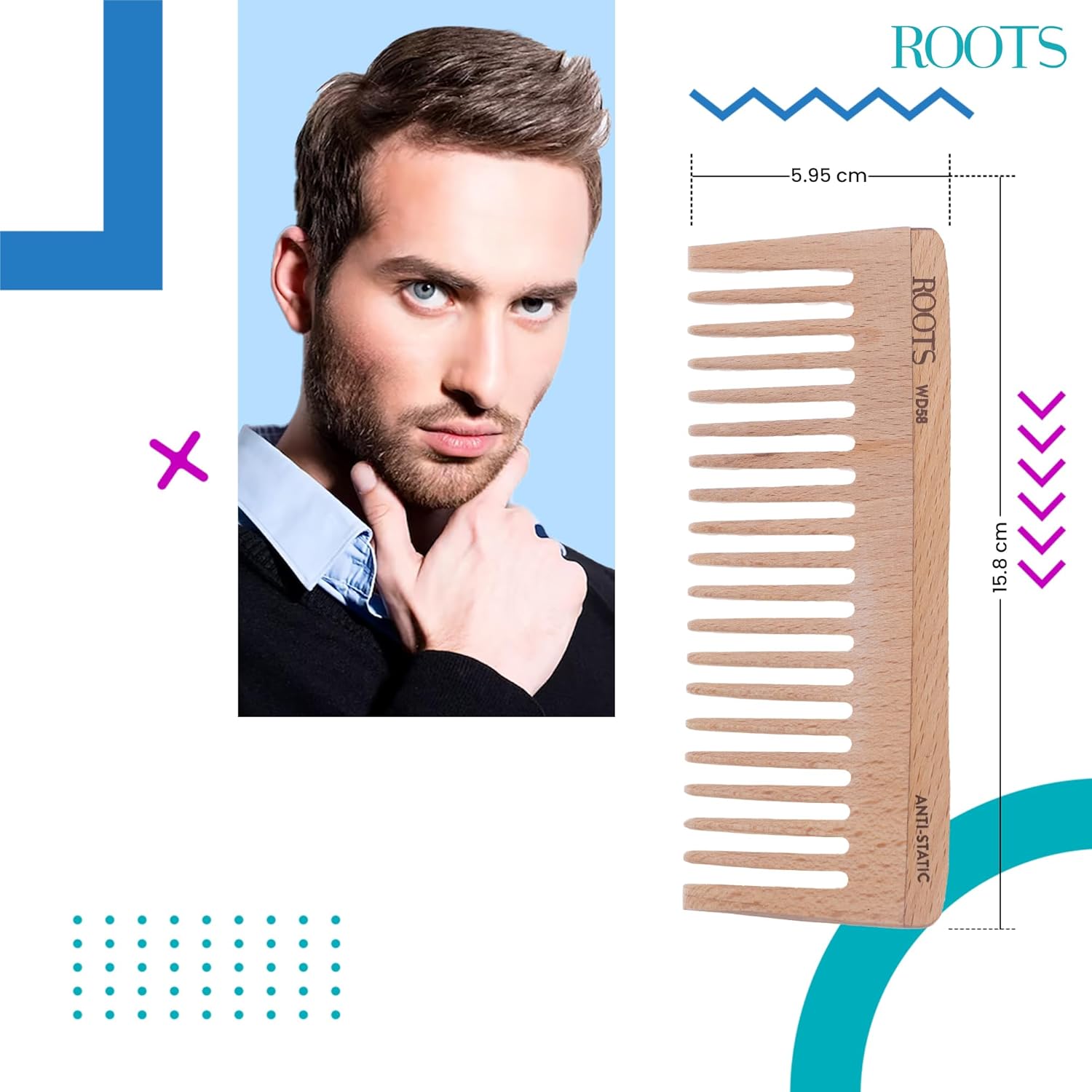 ROOTS Wooden Comb | Wide Teeth | Rounded Teeth prevent Hair & Scalp damage | 100% Natural Wood | Anti-Frizz | For Long, Thick & Dry Hair | For Men & Women | Length – 6.2 Inch, Model No – WD58