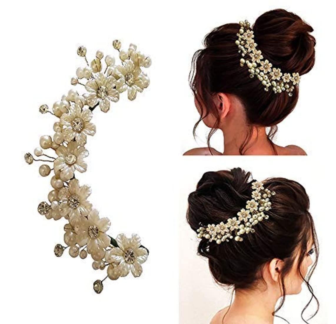 Rose Petals Bridal Hair Bun Clip Tiara For Women Wedding Girls Hair Clip Leaves Pearl Rhinestone Crystal Spray Flower Hair Floral Vintage Hair Barrette Bridesmaids Headpiece White (Bun Clip)