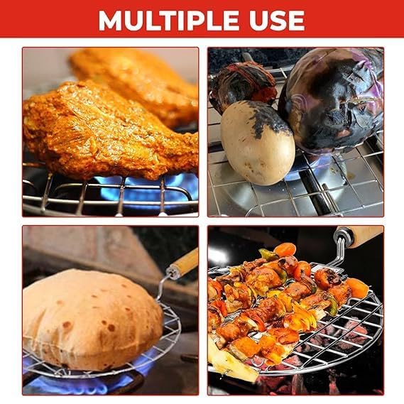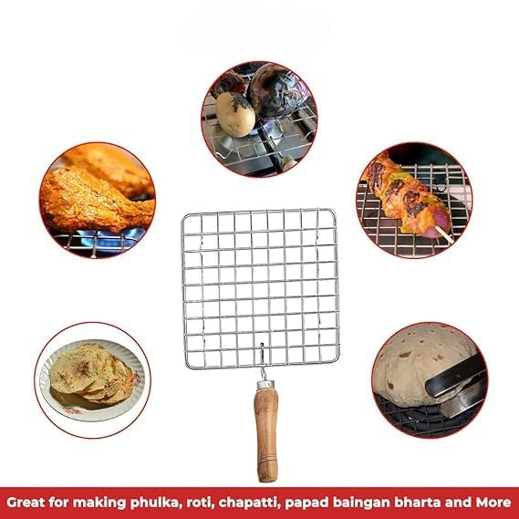 Rostar Square Kitchen Griddle with Wooden Handle, Metal Papad Roti Grill Stand, BBQ Roasting Rack