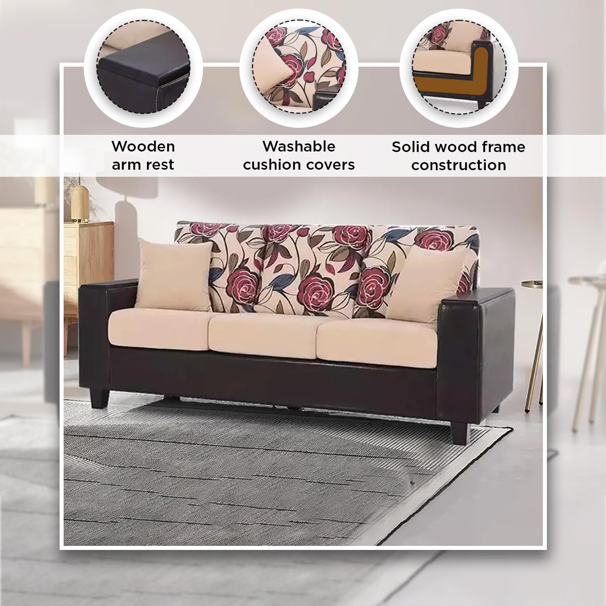 Solid Wood Frame Construction: The sofa 3 seater is designed to last long, especially considering the solid wood framework that makes it incredibly durable and strong. Indeed, it would be a very sturdy construction to make sure that for years to come, one could be sure that this sofa will maintain its form and comfort even with heavy usage.