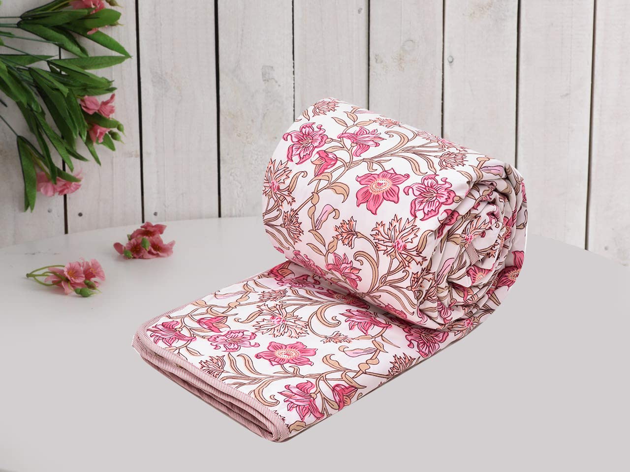 3-Layer Comfort: Made with soft microfiber, breathable cotton, and cozy flannel for ultimate comfort and warmth in all seasons, especially ideal for AC rooms and light winter use.Reversible Design: Stylish white & pink leaf pattern with reversible sides adds charm and versatility to your bedroom décor, allowing for easy style changes anytime.