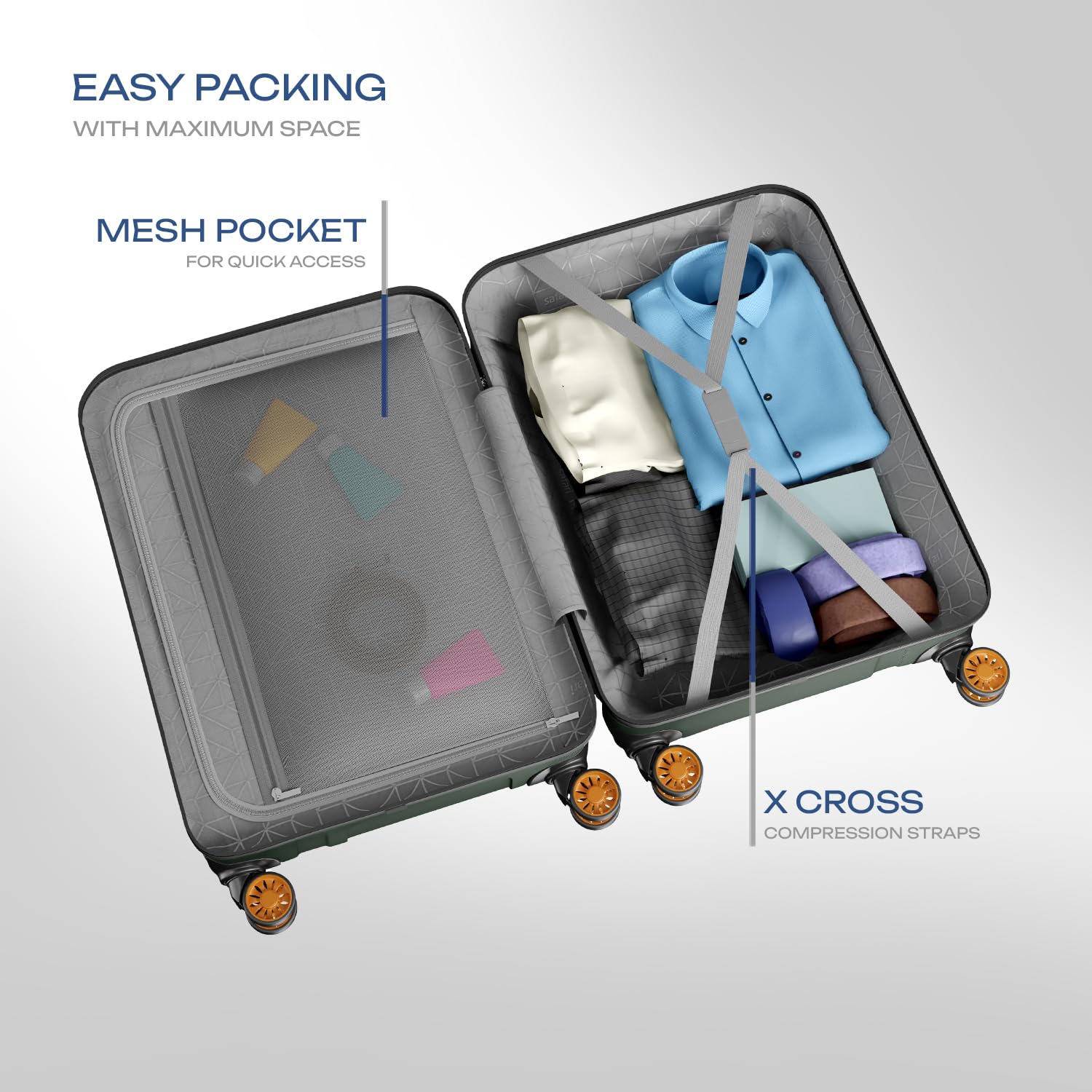 Introducing Safari Insignia – XL size trolley bag that is spacious, secure and effortlessly smooth . Whether you’re relocating, heading on a long vacation, attending a destination wedding, a student moving abroad or simply need extra packing space, this suitcase has you covered. Crafted from premium unbreakable polycarbonate, this trolley bag is designed to withstand the toughest travel conditions. It features a globally recognized TSA – approved lock that ensures your belongings are super secure. Equipped with high performance dual wheels with 360 degree rotation, this luggage can glide seamlessly across all terrains. Proudly Made in India, this trolley bag comes with 3 years warranty on manufacturing defects.
