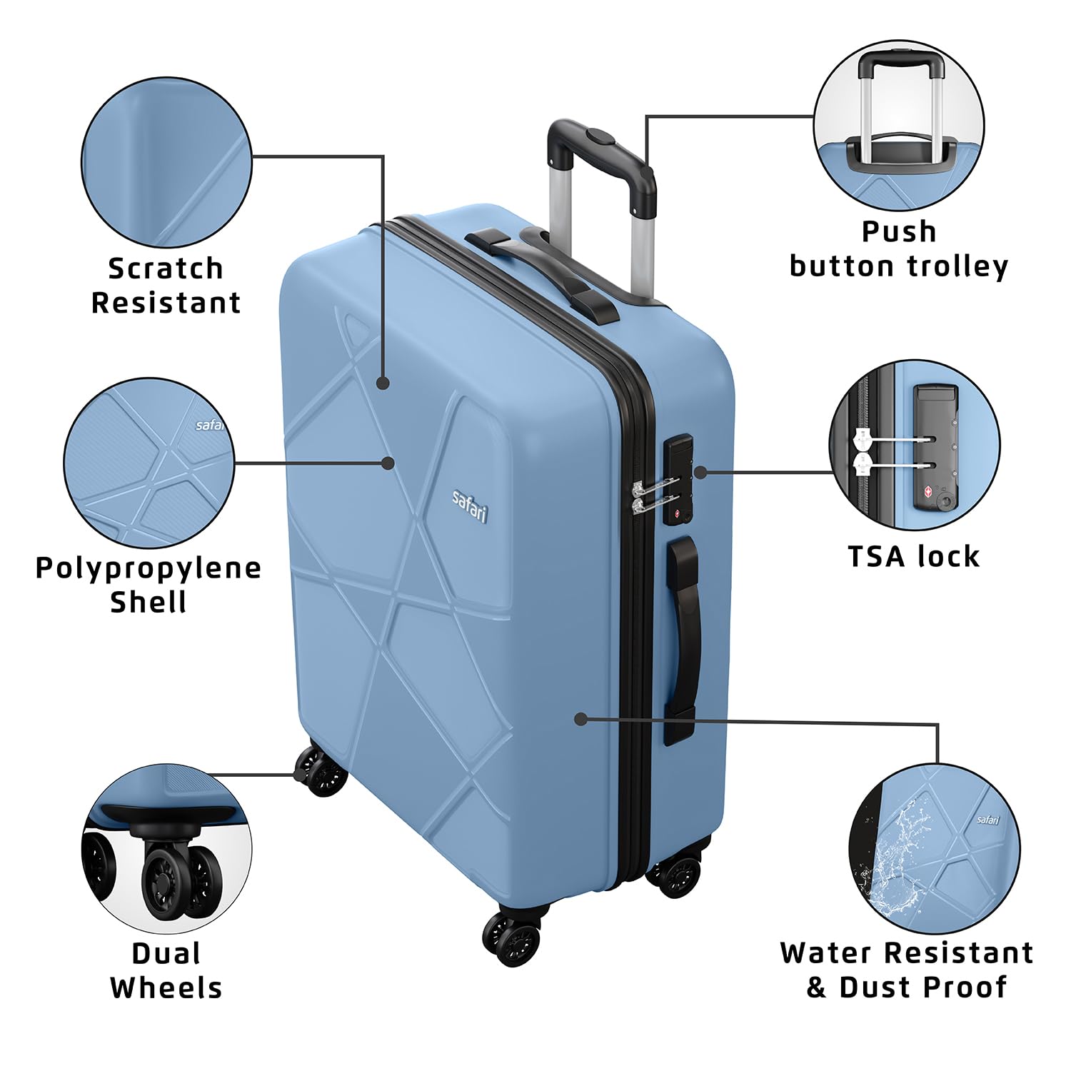 Safari Polypropylene (Pp) Pentagon Plus TSA Lock, 8 Spinner Wheel, Hardside Small, Medium & Large Size Cabin & Check-in Luggage Set of 3 Suitcase, Slate Blue Color 55Cm, 66Cm & 75Cm