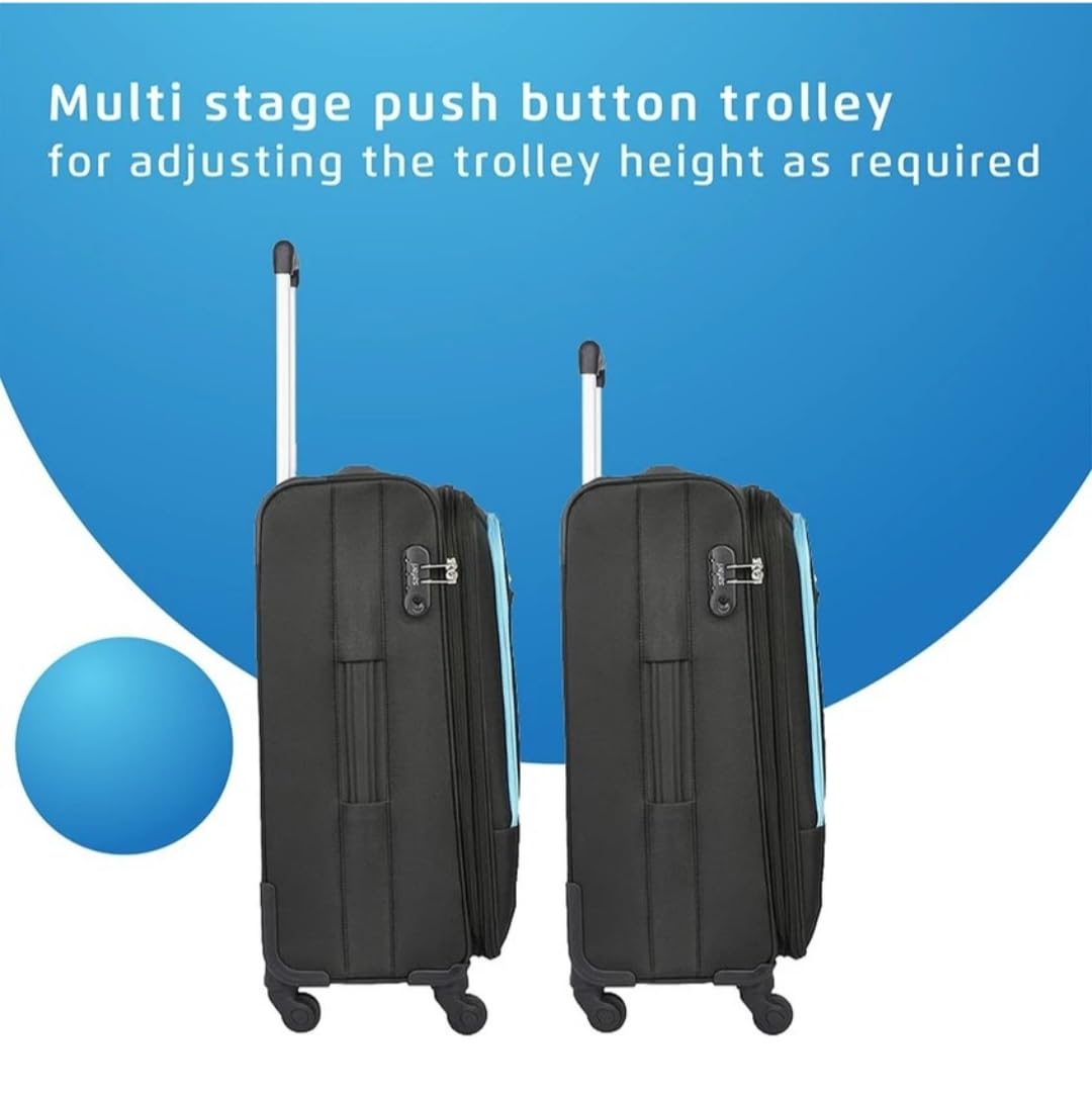 Travel in style with this sleek and practical Safari trolley suitcase. The sophisticated black exterior is accented with eye-catching turquoise blue details, creating a modern and distinctive look. Features include a durable telescopic handle system, smooth-rolling wheels for effortless mobility, and multiple compartments for organised packing. The spacious main compartment and external pockets provide ample storage for all your travel essentials. Constructed with high-quality materials, this lightweight yet sturdy suitcase offers reliable performance for both business trips and leisure travel. The thoughtfully designed interior helps keep belongings secure and wrinkle-free during transit. With its combination of functionality and contemporary design, this Safari trolley suitcase is an ideal companion for the discerning traveller who values both style and practicality.