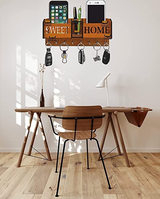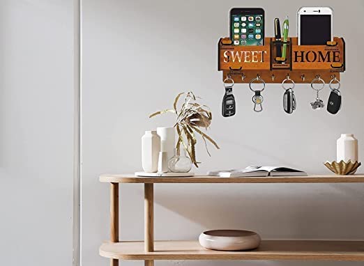 SAGE MDF Wood Wall Mounted Designer Key Holders for Decor Stylish Hook Stand Organizer Home, Office and Living Room Hanging Holder with Mobile Stand (Sweet-Home)