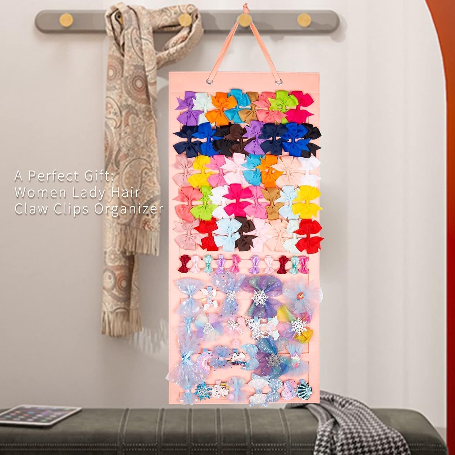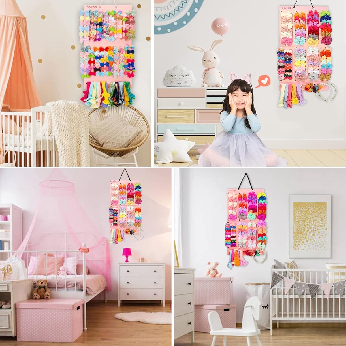 The unique and customized construction of hair bows organizer is very easy to assemble. Just one step to complete the installation. Snap each ribbons on each row to hang it on the door, wall, closet with double rope. No small parts might cause any hazels for your baby girls.