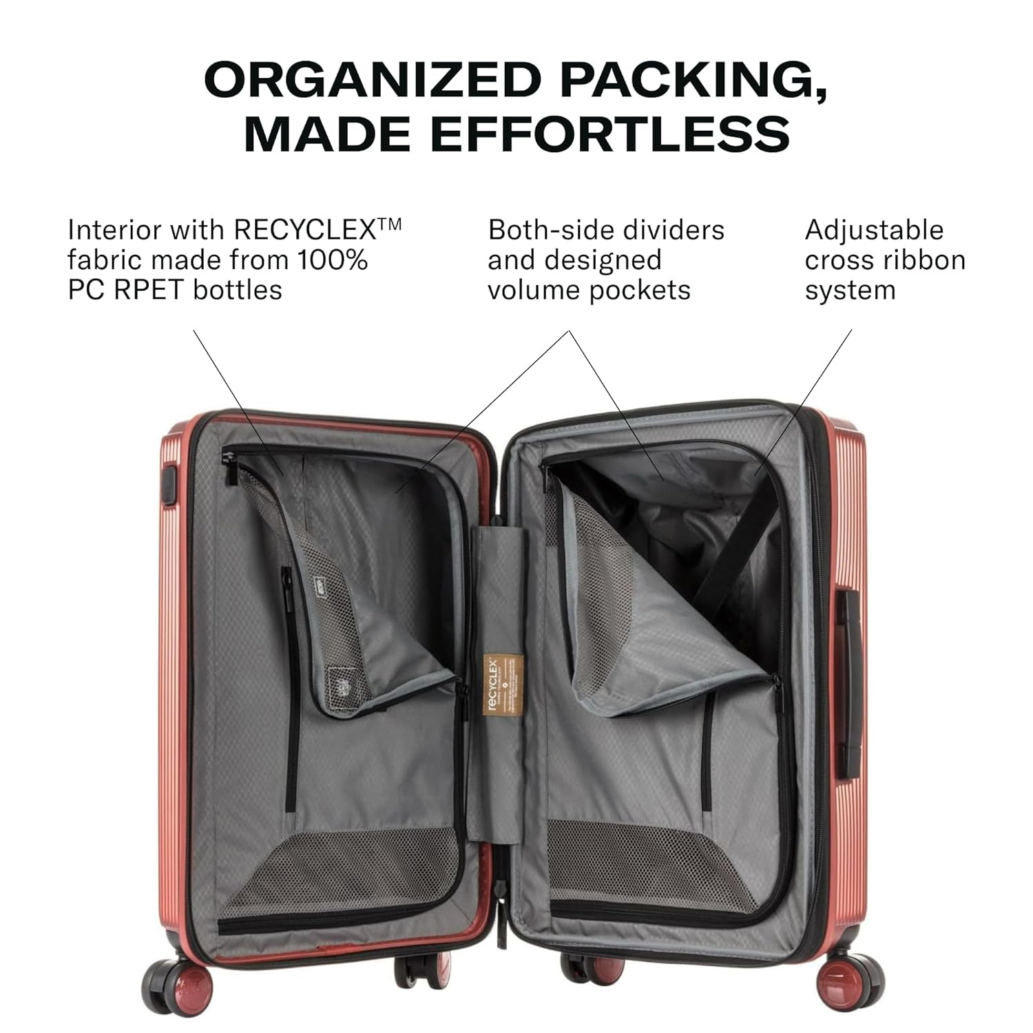 The line is equipped with all essential features for traveling as anti-theft security zipper, smooth double wheel with ball bearing, full size expanders, and rich both-side dividers. The designed volume pockets make organization easier. Interior is fully covered by RECYCLEXTM fabric technology from 100% post-consumer recycled PET bottles. Myton’s impressive design, available in striking color options and with a complete set of features, encompasses every travellers needs.