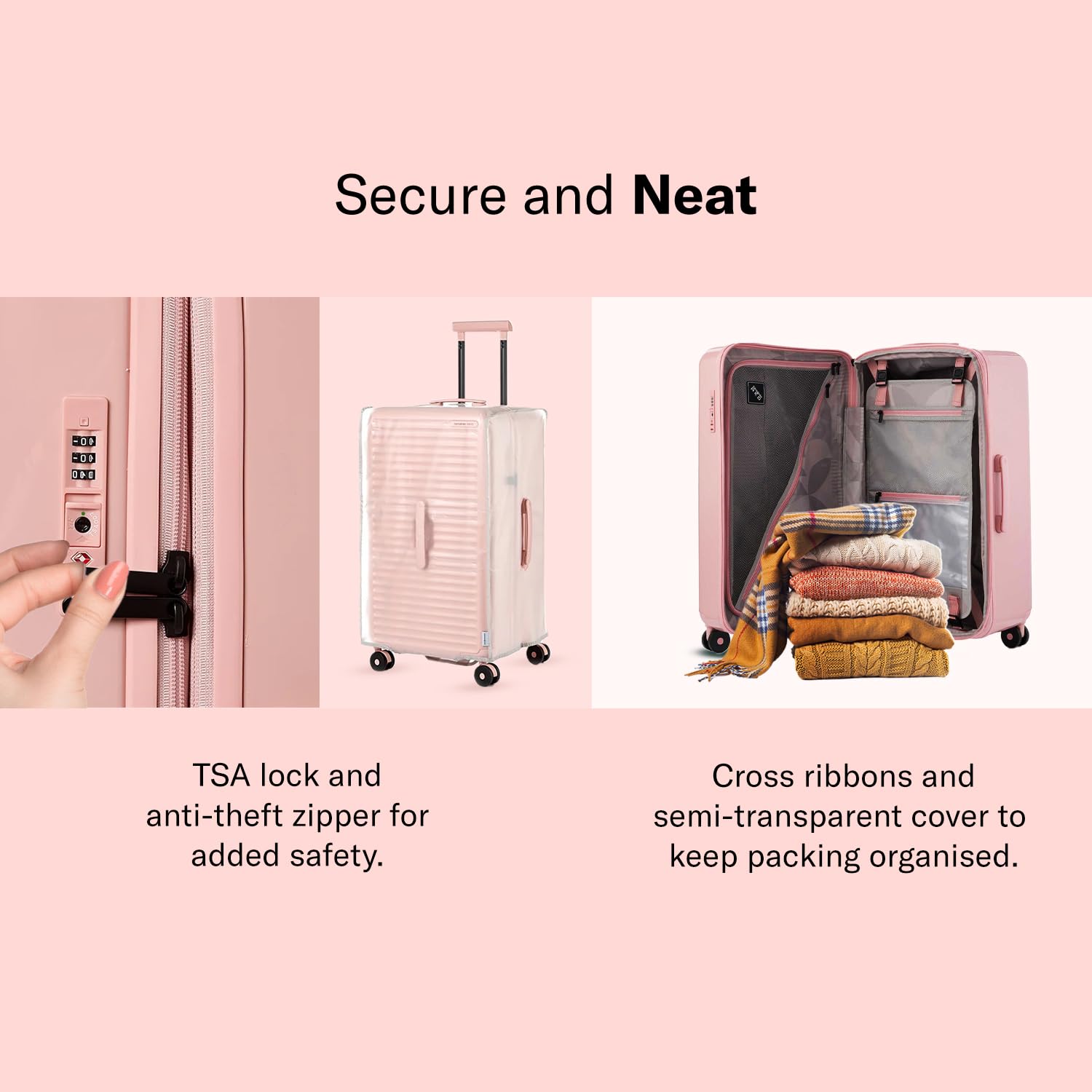 Double wheels with ball bearing provide smooth rolling comfort. | Cross Ribbons. | Semi transparent luggage cover to keep your luggage in prisitine condition.