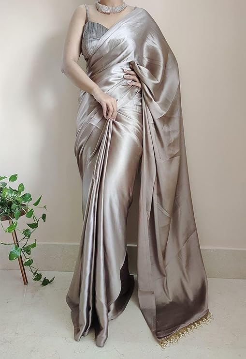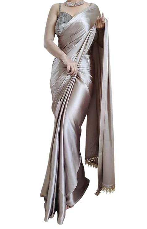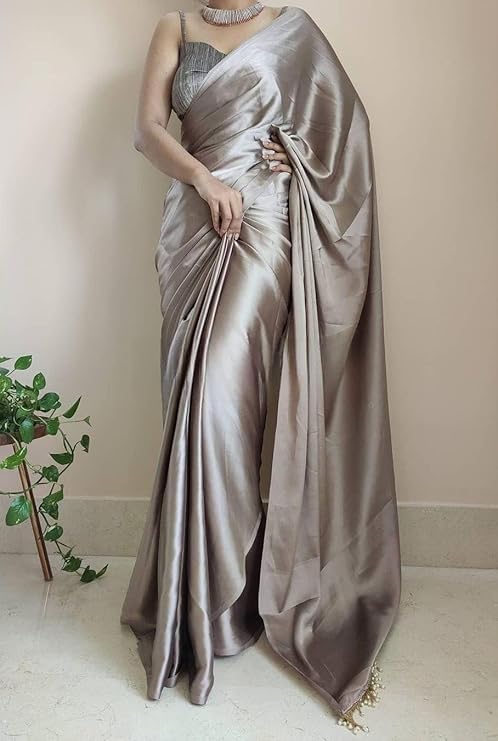 Samtrish Women’s Regular Wear Satin Silk Pre Pleated Heavy Saree with Blouse For Festival, Party, Wedding,farewell, fuction saree (Grey)