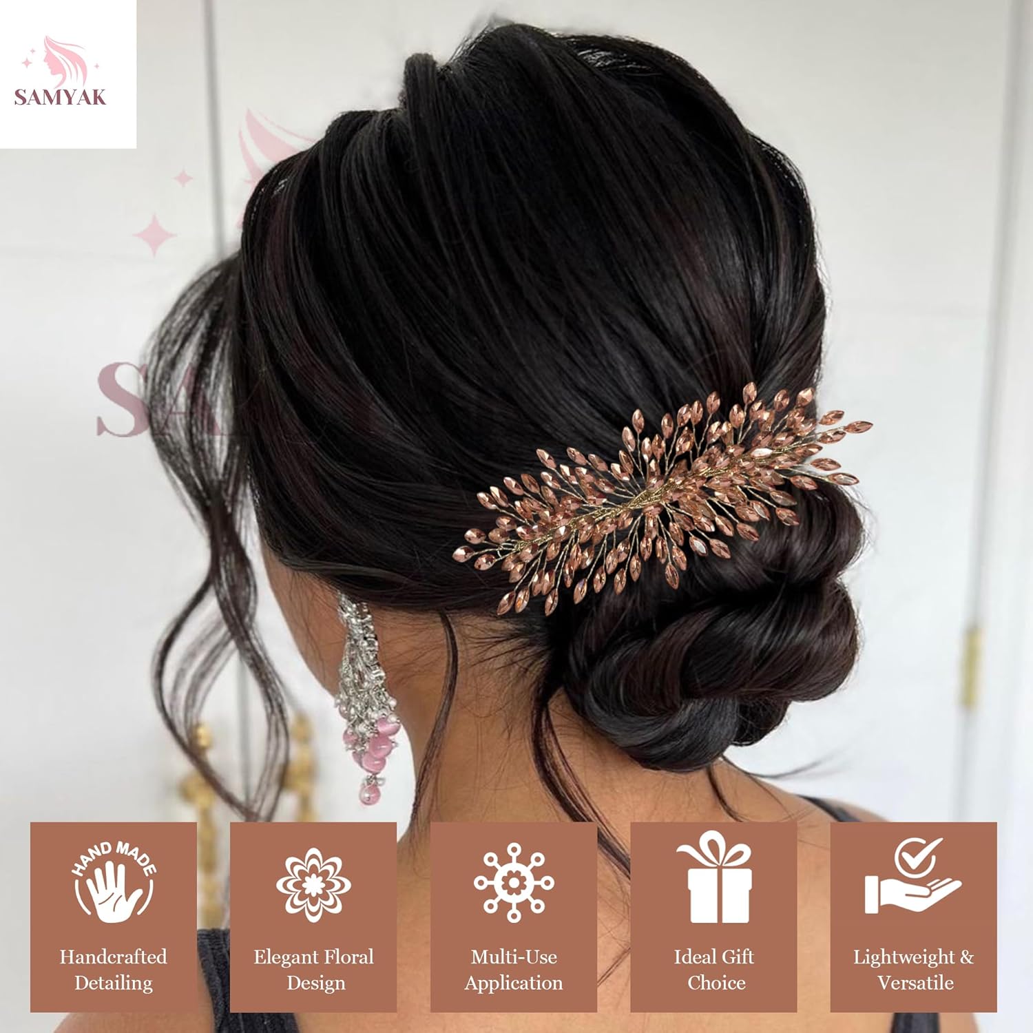 Samyak Wedding Leaf Hair Accessory Beaded Rhinestone Bridal Bridesmaid Hair Pin Brooch (Rose Gold)