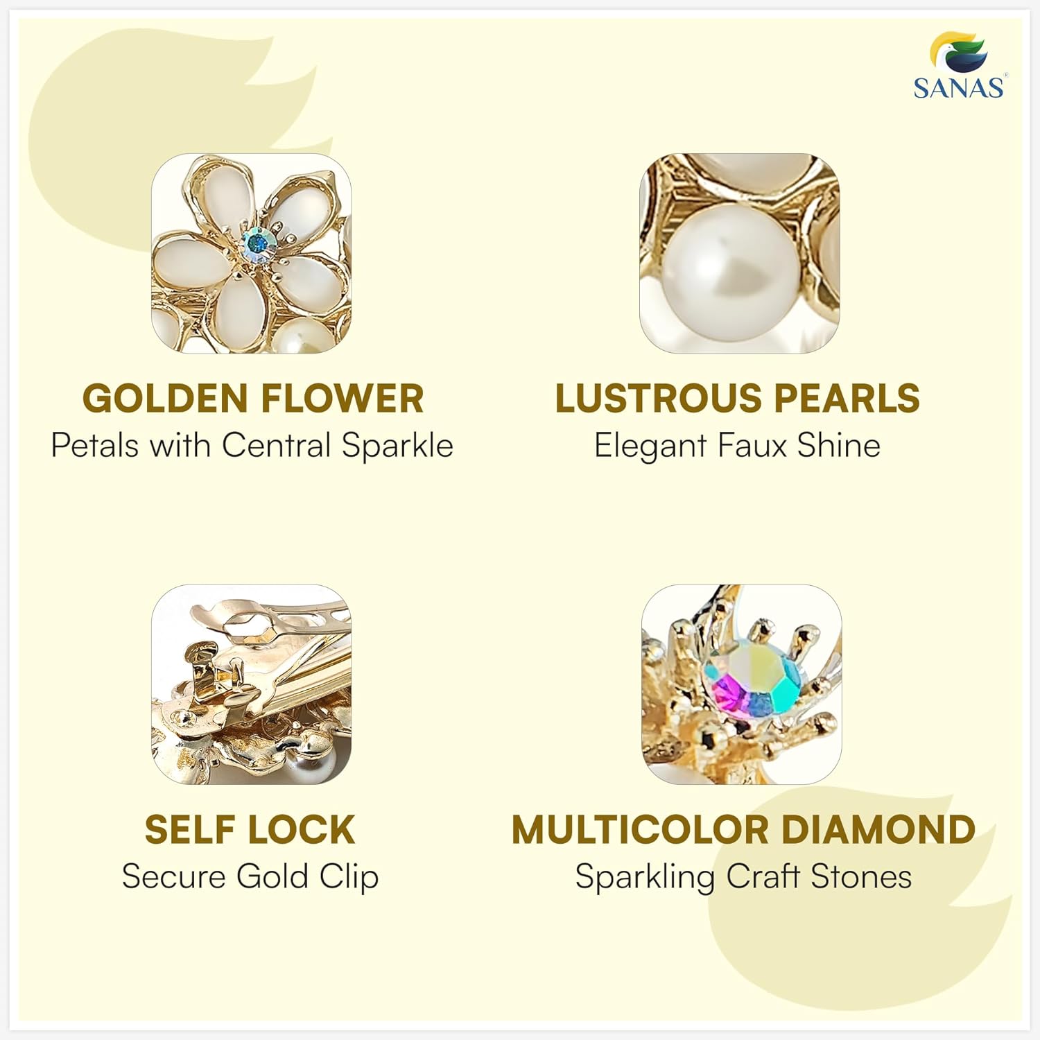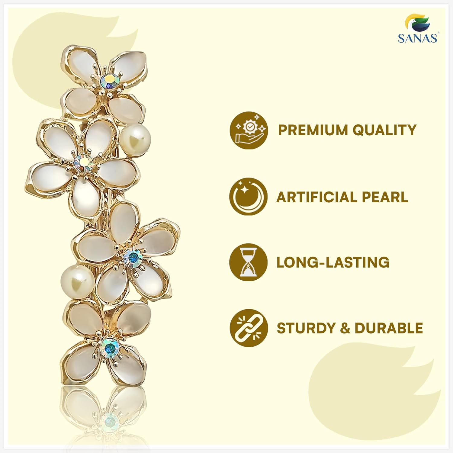 Flower hair clip with pearl and rhinestone accents in a floral design, shown next to branded SANAS packaging. This stylish claw clip is perfect as a crystal hair clutcher for women.
