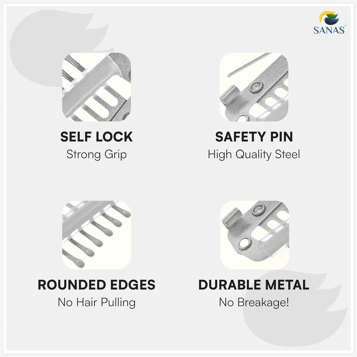 Firm Grip, No Slip – Designed with 10 strong teeth and a sturdy snap-lock mechanism, each Sanas hair extension clip offers a dependable grip. These clips stay in place even during movement, securing hijabs, saree pallus, and dupattas without slipping—perfect for long-lasting hold on busy days.