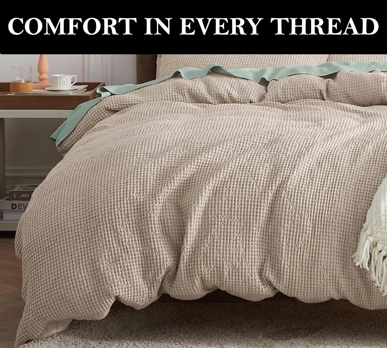 Elegant Waffle Texture – ::Timeless Style & Inviting Feel Designed with a refined waffle weave pattern, this comforter set brings a modern yet timeless elegance to your bedroom. The three-dimensional texture not only adds visual depth but also creates a cozy, tactile experience that enhances your comfort. This unique woven design elevates your space with subtle sophistication while maintaining a relaxed, inviting atmosphere.