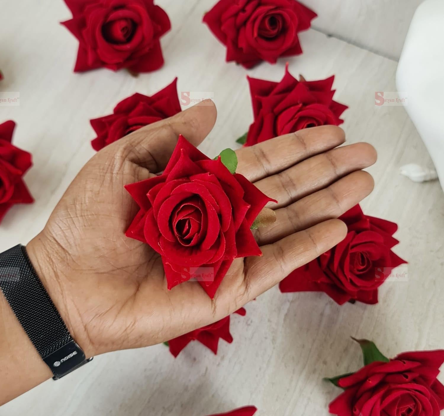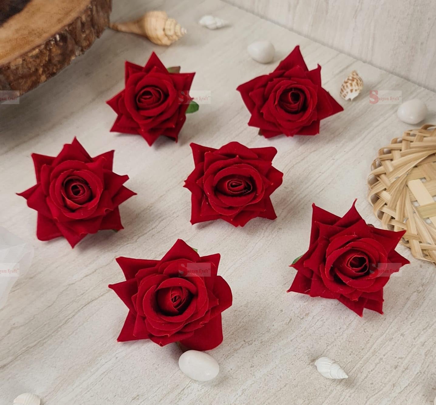 Package Include : 6 Pieces Artificial Rose Velvet Flower/ Color : Red / Material:- Fabric / SIZE: 6 cm x 6 cm ( L x H)