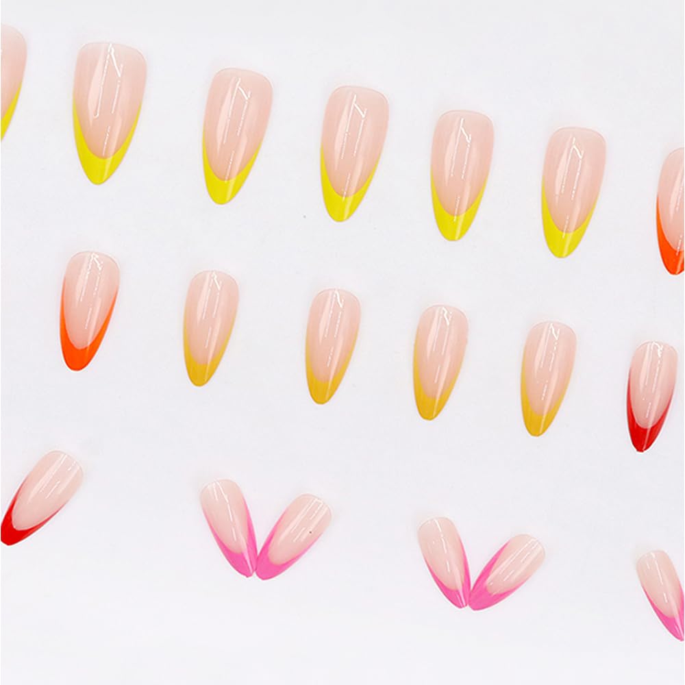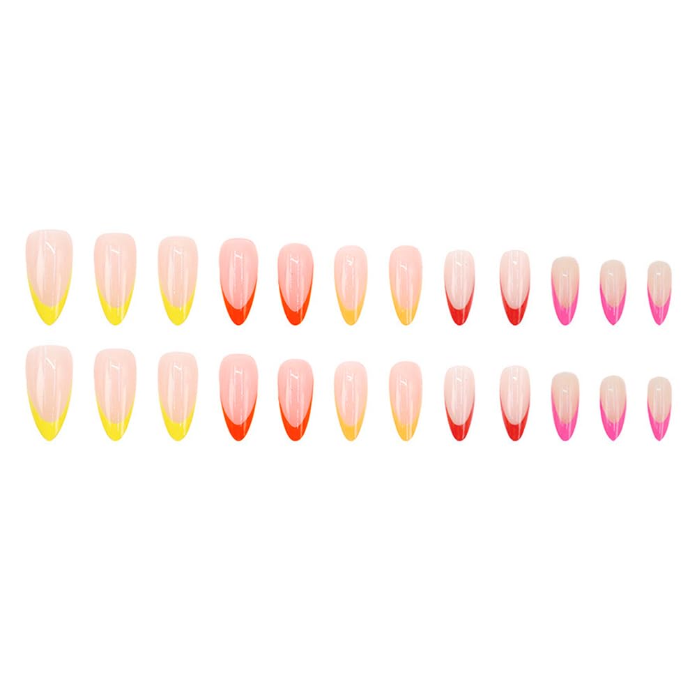 Secret Lives Glossy Reusable Artificial Almond Shape Translucent Skin Color with Red Pink Orange & Yellow Tips Design Press on nails 24 Pieces Set with Kit