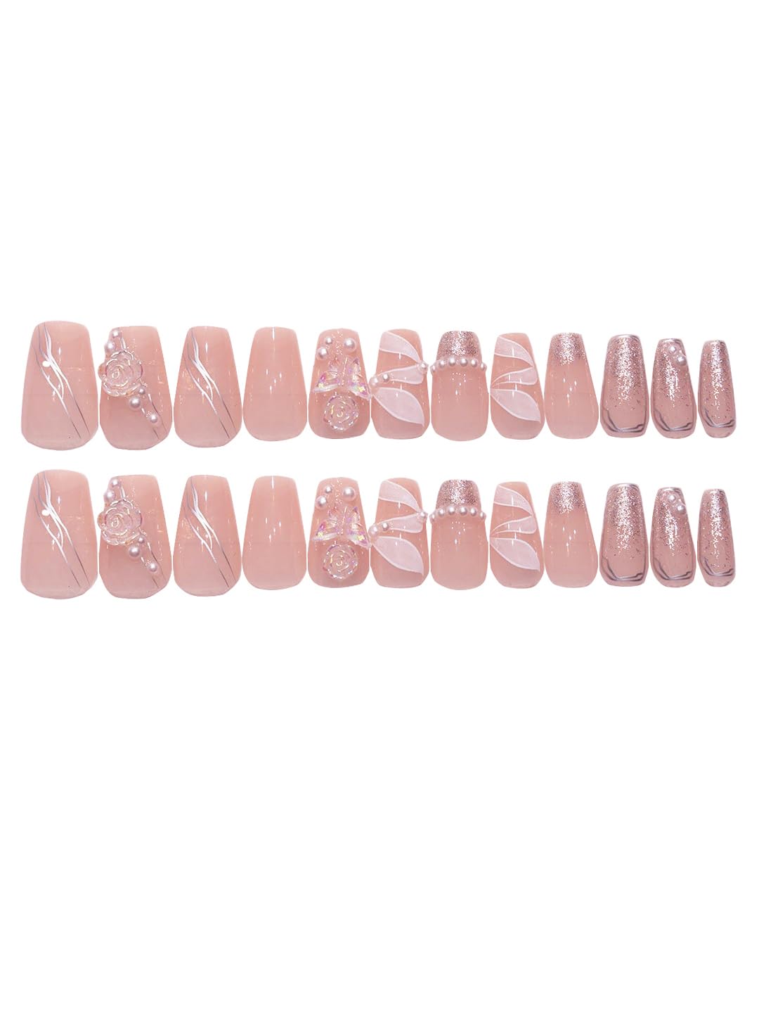 Secret Lives Glossy Reusable Artificial Translucent Pink Color with 3D Flower & Butterfly and 3D Studs Fake False Press on Nails 24 pieces Set with Kit