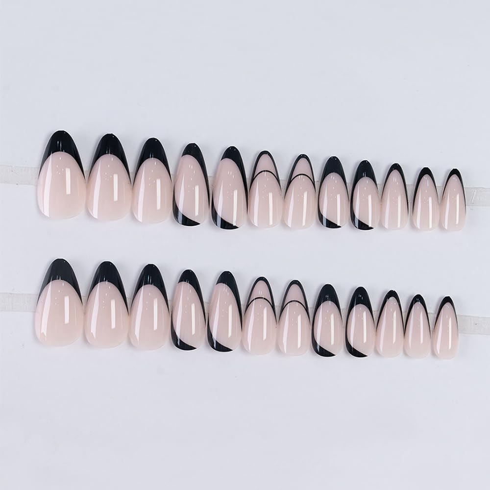 Secret Lives Glossy Reusable Artificial Translucent Pink Color with Black Design Press on nails 24 Pieces Set with Kit