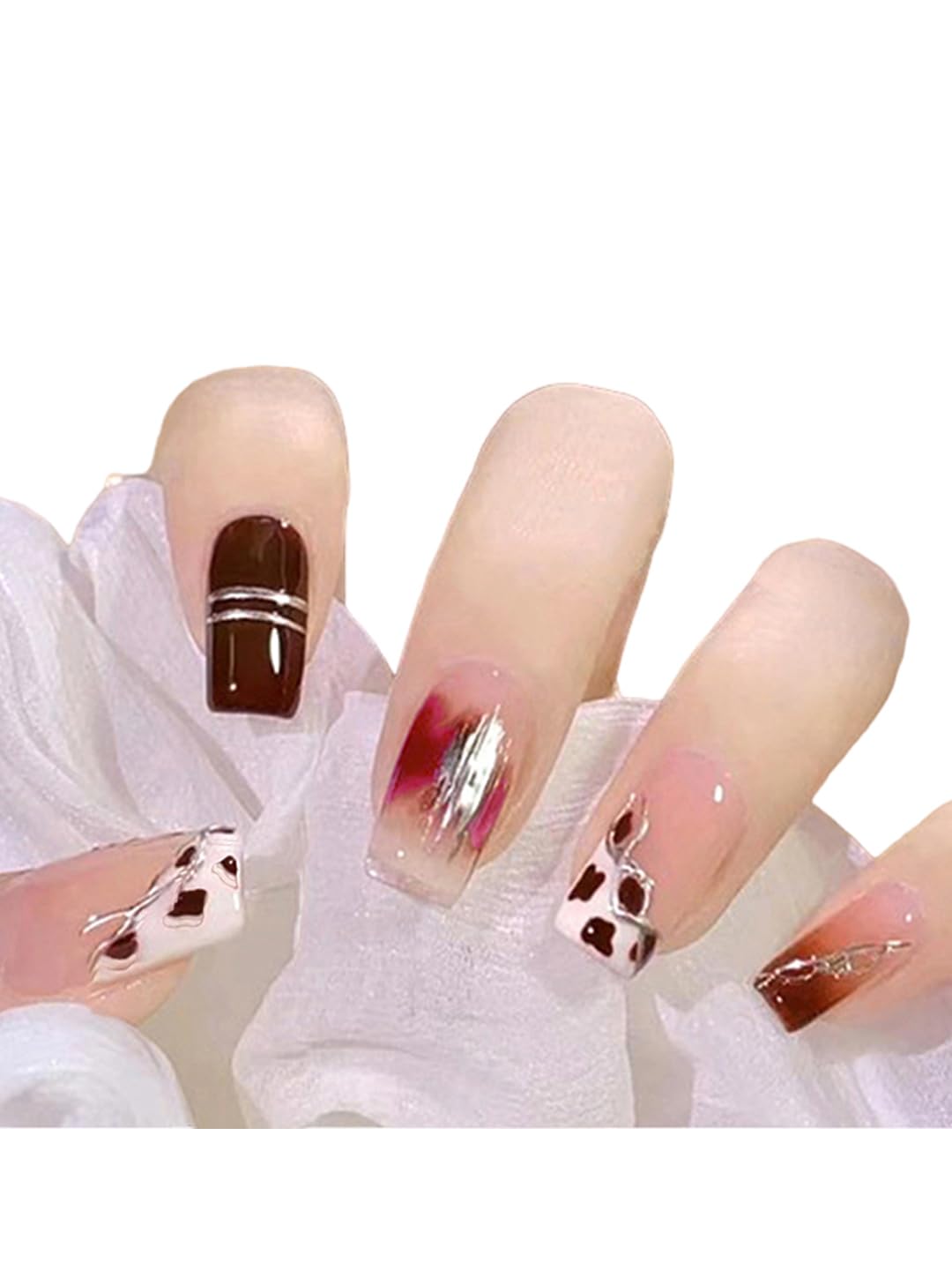 Secret Lives Reusable Artificial Acrylic Press on Nails Transparent With Brown Patches & Silver Color Lines 24 Pieces Set With Kit