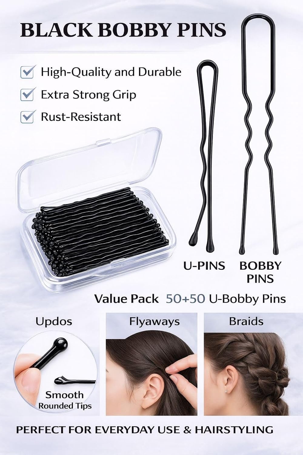 Complete Hair Styling Set: Value pack includes 50 bobby pins and 50 U-pins (100 pieces total) in black colour, perfect for creating updos, braids, and securing flyaways for everyday use and special occasions