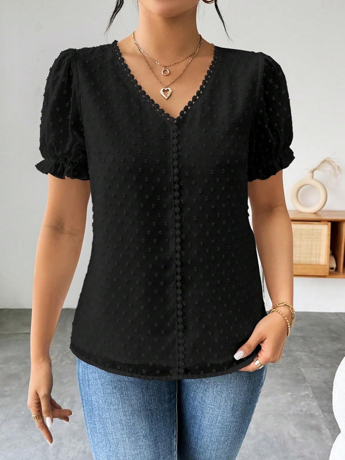 Shasmi Women’s Elegant French Textured Fabric Solid Black Color Lace Panel V-Neck Jacquard Blouse,Short Puff Sleeve Tops Simple Daily Spring/Summer Casual Blouse Shirt, Colour: Black, Hem Shaped: Regular, Style: Casual, Sleeve Type: Puff Sleeve, Details: Contrast Lace, Button, Frill, Neckline: V neck, Type: Top, Pattern Type: Plain, Sleeve Length: Short Sleeve, Length: Regular, Fit Type: Regular Fit, Fabric: Non-Stretch, Material: Woven Fabric, Composition: 100% Polyester, Care Instructions: Machine wash or professional dry clean, Sheer: Semi-Sheer
