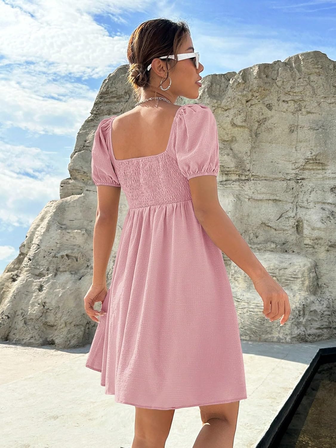 Shasmi Women’s & Girl’s Dress for Women l One Piece Dress for Women l Beach Dress for Women, Solid Textured Puff Sleeve Square Neck Midi Dress