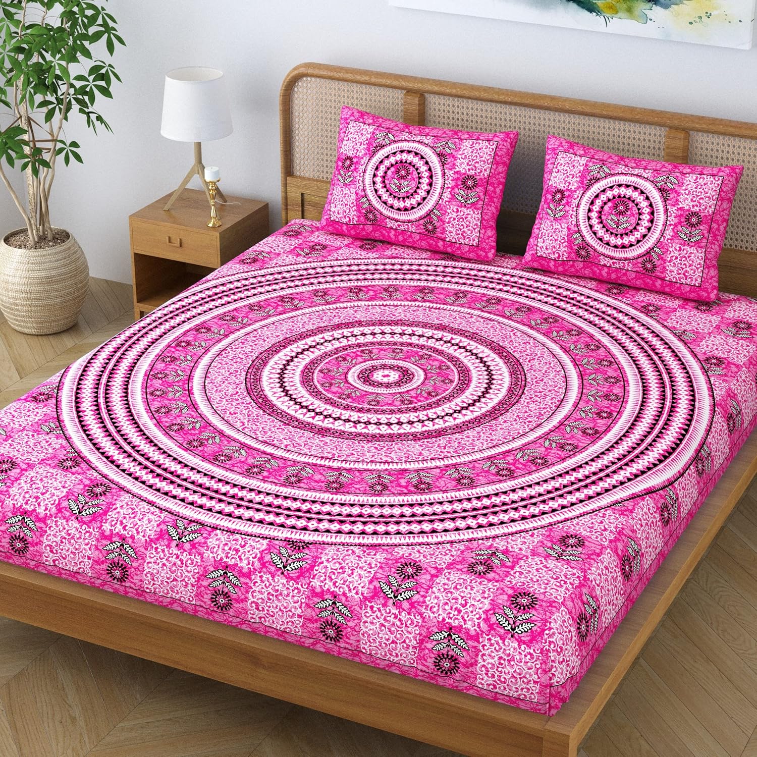 SheetKart Lily Floral Cotton Double Bedsheet Jaipuri Printed Bed Cover with 2 Pillow Covers – Pink Pearl
