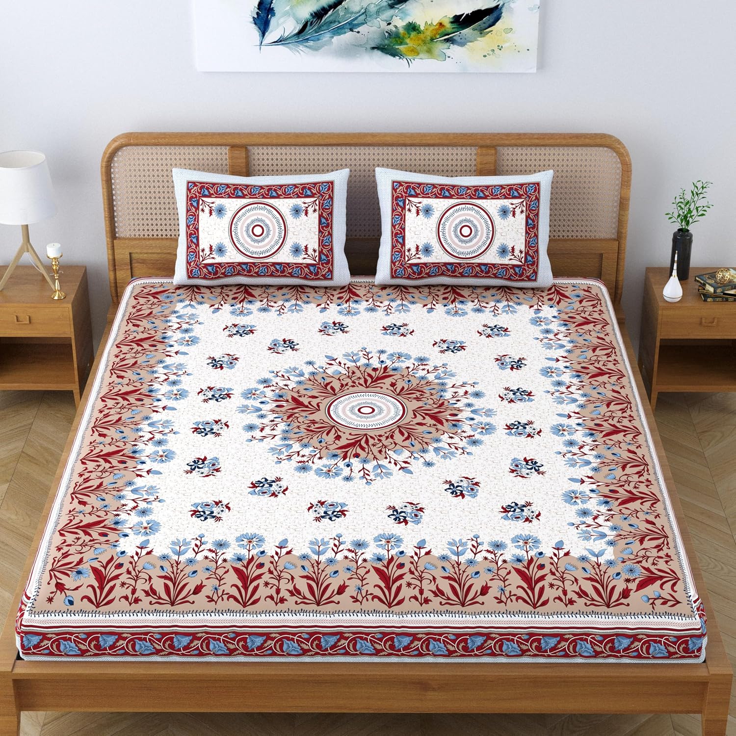 Add a touch of Rajasthan’s artistic heritage to your home with this SheetKart Pure Cotton Jaipuri Bedsheet Set. Designed with a beautiful mandala floral print in orange, it blends tradition with modern style, enhancing any bedroom décor. Crafted from breathable and soft cotton, this bedsheet ensures year-round comfort and restful sleep. Its king-size dimensions (220 x 240 cm / 86 x 94 inch) make it a perfect fit for large double beds, while the two matching pillow covers complete the coordinated look. Durable, colorfast, and easy to maintain, this bedsheet is ideal for daily use as well as gifting.