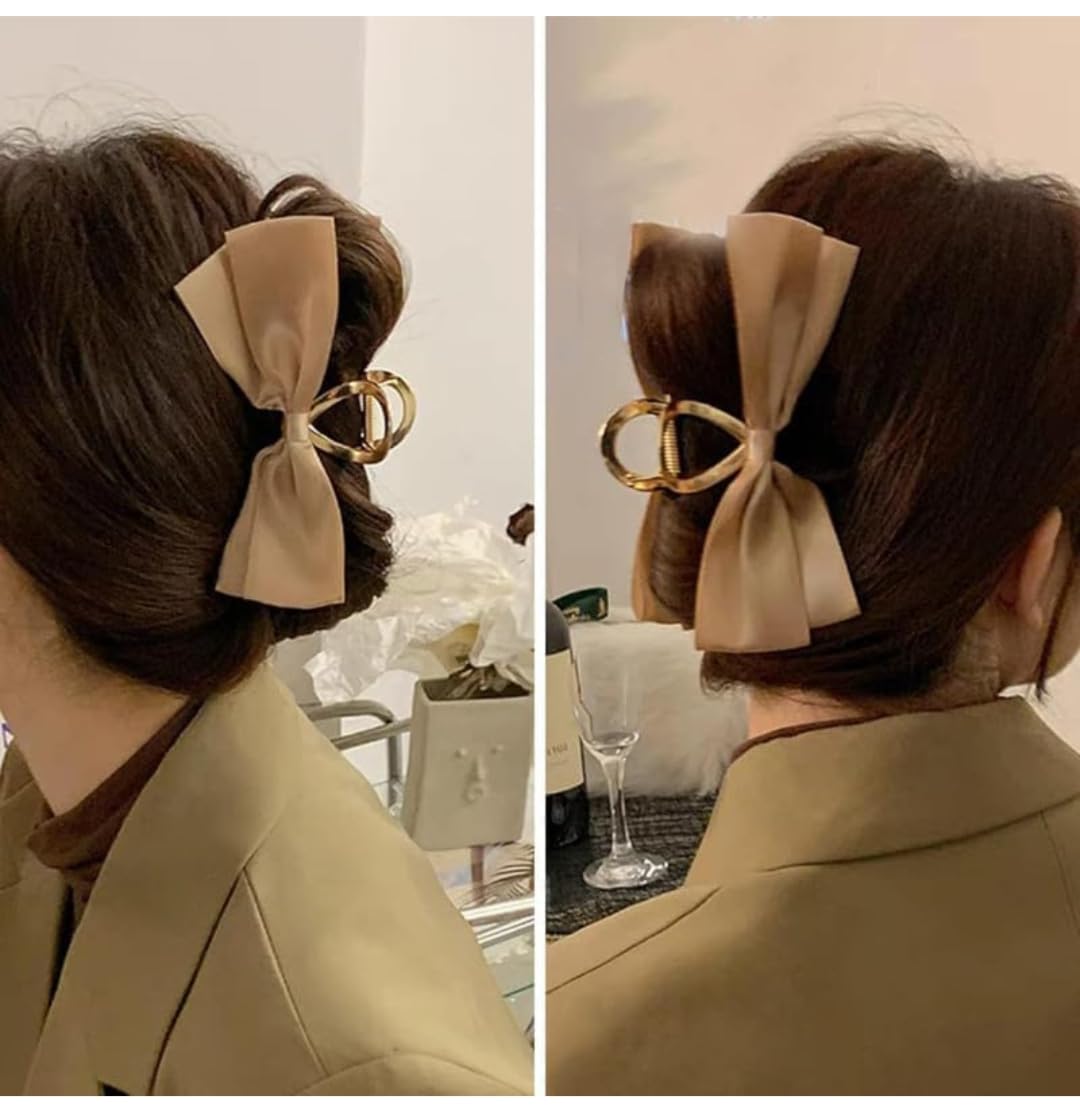 Shidara 1 PCS Satin Bow Claw Clip | Large Hair Bow | Khaki Bow Hair Clip for Women – Casual & Formal Wear | Non-slip Strong Hold | For Girls and Women with Thick and Thin Hair