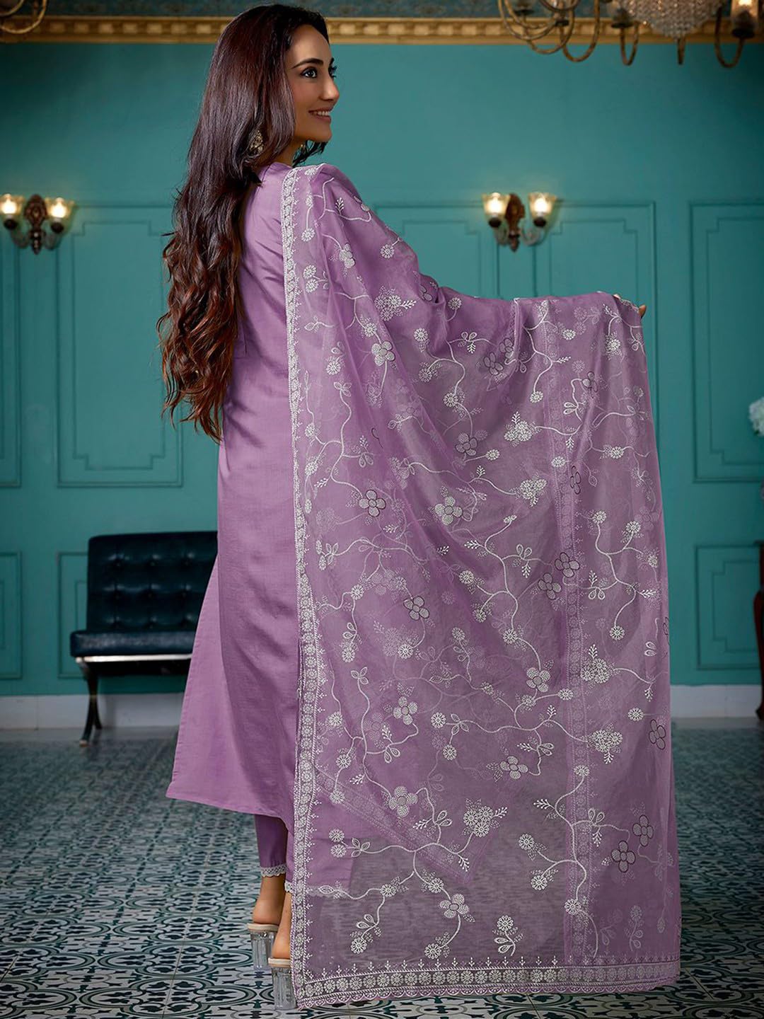 Purple embroidered kurta set with dupatta and pants for festive, party, or ethnic wearPurple embroidered kurta set with dupatta and pants for festive, party, or ethnic wear