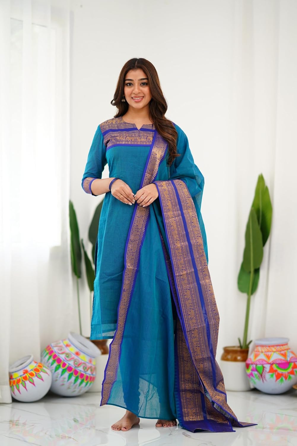 Elevate your ethnic wardrobe with this exquisite SHIJILA Women’s Kanchi Cotton Kanjivaram Kurta with Dupatta, thoughtfully crafted to blend traditional aesthetics with modern comfort. This kurta set is a perfect reflection of elegance and simplicity, tailored to make every woman feel confident and beautiful.The kurta is made from cotton that ensures breathable comfort, ideal for Indian weather throughout the year. Its soft texture and soothing green tone offer a refreshing appeal, while the intricate thread work at the neckline enhances its charm. Designed with a V-neck and three-quarter sleeves, this piece effortlessly flatters your silhouette and complements all body types.What truly sets this ensemble apart is the beautifully crafted dupatta, adorned with golden woven borders. The contrast of colors gives the set a rich, festive look suitable for weddings, traditional ceremonies, office celebrations, or casual family get-togethers. The lightweight dupatta drapes gracefully, providing a fluid, elegant finish to your outfit.Whether you’re looking for a daily wear ethnic option or an occasional wear ensemble that doesn’t compromise on comfort or style, this kurta set is your go-to solution. Pair it with traditional jhumkas, bangles, or even minimal accessories to suit the occasion.Easy to maintain and gentle on the skin, this kurta set makes an excellent gift option for women during festivals, birthdays, or special milestones. When tradition meets contemporary design, you get SHIJILA – where style is stitched with comfort.
