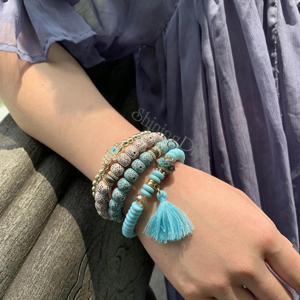 Shining Diva Fashion Bohemian Evil Eye Lucky Protection Hamsa Hand Tassel Charm Beaded Bodhi Stylish Multilayer Bangle Bracelet for Women and Girls