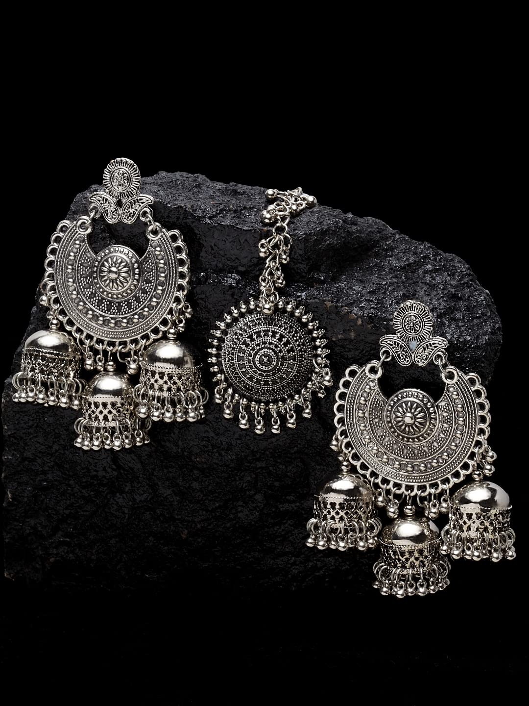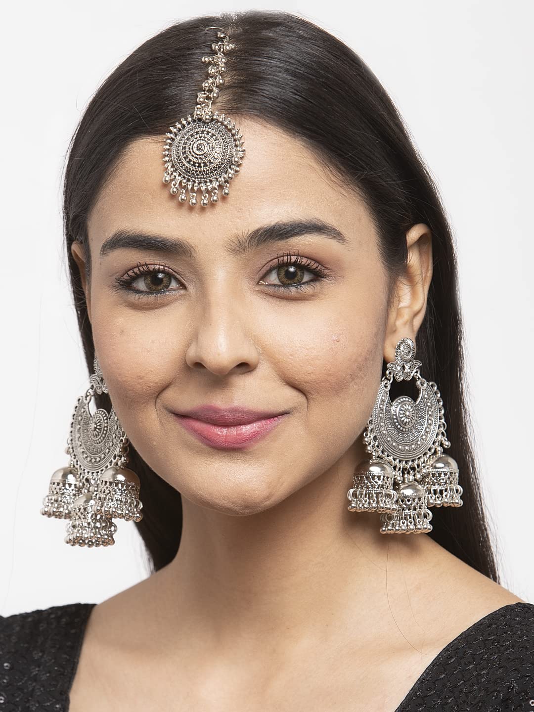 Shining Diva Fashion Latest Oxidised Silver Antique Design Stylish Traditional Maang Tikka Jhumka Earrings Jewellery Set for Women