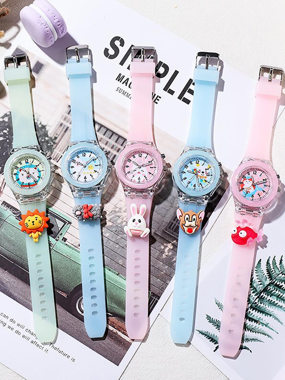 Introducing the Cartoon Unicorn Pink & Kitty Blue Light watches for kids, a combo of two great looking stylish watches for girls and boys. These watches feature a big round dial window, making it easy to read. The adjustable strap is suitable for wrists up to 9 inches in circumference, making it perfect for ages 3-14 years old kids to learn time. You can make the watch even more fun with a press of the button, which activates 7 multicolour disco lights around the dial. The material of the strap is made up of silicone, which makes it very comfortable and durable. This watches also features a unique radium strap that is sure to stand out. Get the Light watch for kids and make learning the time fun!